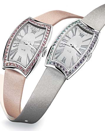 The first, Imperial Topaz, offers a subtle pink hue and stainless steel case. The second, Garnet vanadium, presents a light green satin look in which the stones change color depending on light and temperature. Both timepieces feature a dial inspired by the Art Deco traditions. Their tonneau-shaped cases are waisted at 6 and 12 o’clock. The new designs retail for approximately $4310. For inquiries contact sales@bedat.ch.