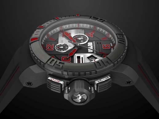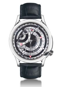 The dial design was inspired by the speedometer and rev-counter layout that traditionally dominates most car dashboards. The Chronozoner's time zone adjustment is accomplished by opening the locking lever at the side of the case and rotating the engraved bezel so that the city relevant to the required time zone is at 12 o'clock. The lever is then closed and the watch is now securely set to local time and synchronized with a skeletonised 24-hour hand to differentiate between night and day.