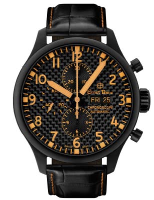 The dial comes in black matte with white luminous numerals or black matte/orange luminous numerals; or black carbon fiber/white luminous numerals; or black carbon fiber/orange luminous numerals. The calendar system is color matched to the dial. Strap comes in nylon, calf leather, aviator leather, handmade alligator, and handmade aviator alligator. For inquiries contact Lydia@ernstbenz.com.