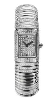 Precious stones frame the cases in horizontal lines or are arranged across the dial in “a playful way.” The top-of-the-line watch, or the “ultimate wrist candy,” as Links of London calls it, is a diamond encrusted Sweetie watch (shown) that incorporates over 450 diamonds on its dial, case and around the bracelet.