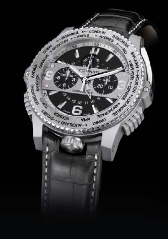 The Chronozoner is geared to the internationally minded sports enthusiast and combines two complications in a single watch. According to Vogard, the new model offers improved functionality over standard chronographs thanks to the unique arrangement of its winding crown and push pieces. The crown is positioned at six o'clock, while the chrono stop/start pusher is found at four o'clock and the reset pusher at eight o'clock. The watch also offers extra large pushers that are described as “finger pedals” based on the design of a sports car’s control pedals.